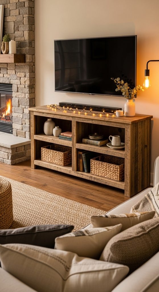 Rustic wooden designs bring warmth and charm to your living room. Using reclaimed wood or distressed finishes, these entertainment centers add a cozy farmhouse vibe. Pairing them with soft lighting enhances the overall ambiance.