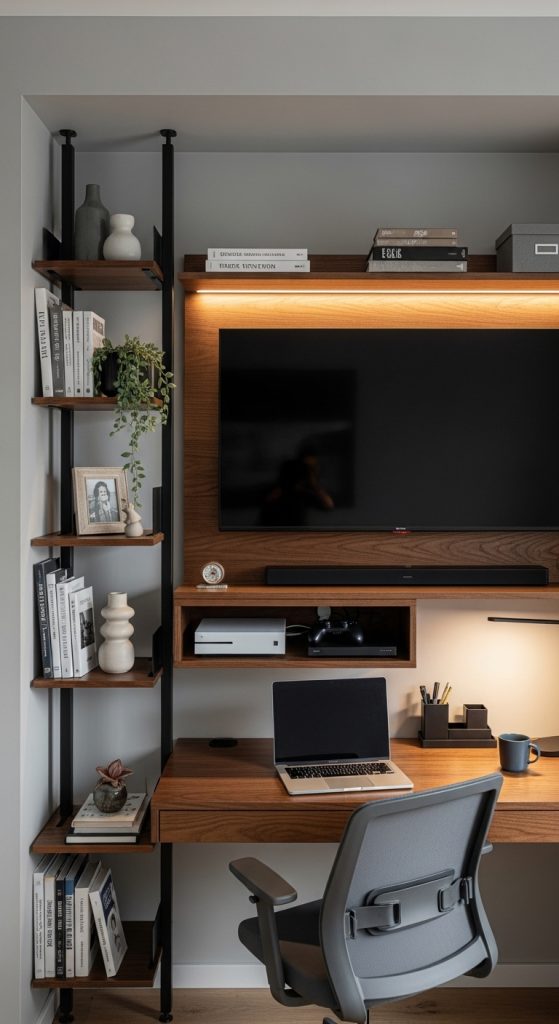 Industrial designs combine metal frames with wooden shelves for a bold and edgy look. Exposed pipes, dark tones, and raw textures make this style perfect for urban or loft-style living rooms.