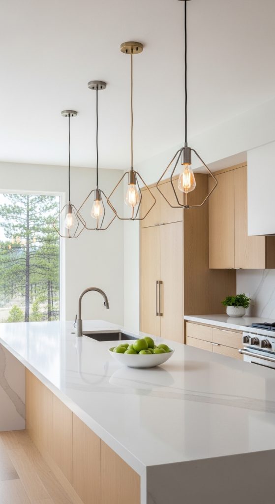 Hang a stylish pendant light or a cluster of mini chandeliers above your island. This not only illuminates the workspace but also draws attention to the island, enhancing its role as the centerpiece of the kitchen.