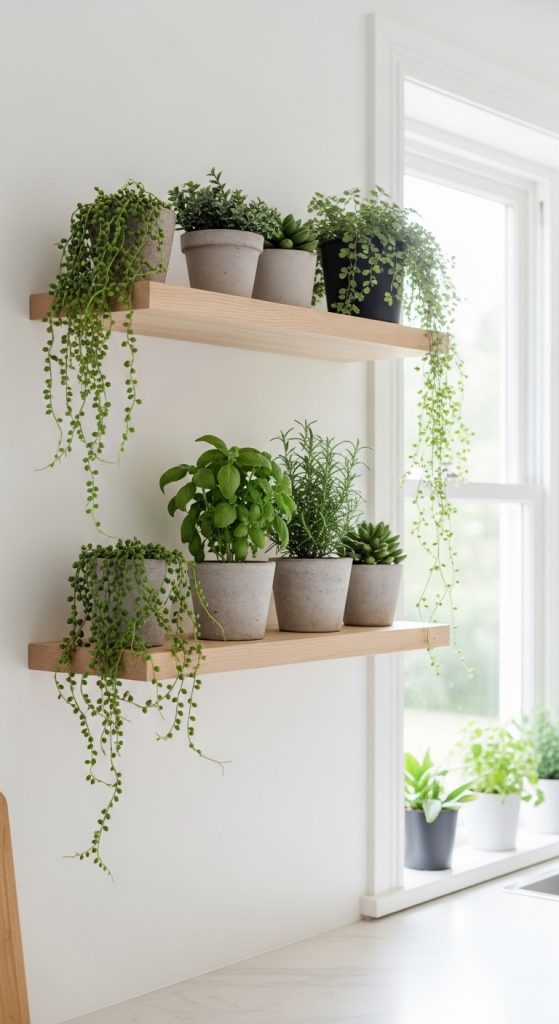 Incorporate small potted plants or hanging greenery on your open shelves. Plants add freshness, vibrancy, and a natural touch to your kitchen, enhancing both aesthetic appeal and air quality.