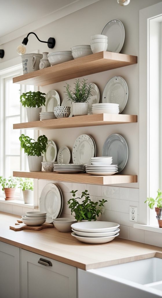 Install floating wooden shelves above the countertop to create a natural and warm look. Use them to display ceramic plates, jars, and small potted herbs. Floating shelves keep the kitchen open and airy while offering plenty of storage.