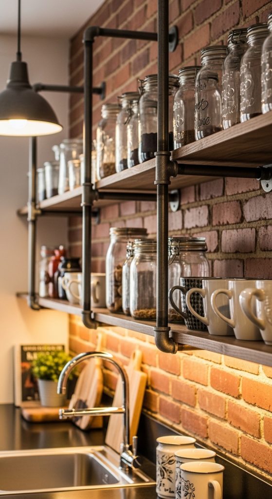 Combine industrial-style metal pipes with wooden planks to create unique shelving. This look pairs beautifully with exposed brick walls or stainless steel appliances. It’s perfect for storing glass jars, coffee mugs, or cookbooks.