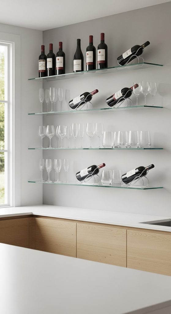 Glass shelves provide a sleek and minimalist look. They reflect light, making the kitchen appear brighter and more spacious. Ideal for displaying glassware, wine bottles, or delicate dish sets.