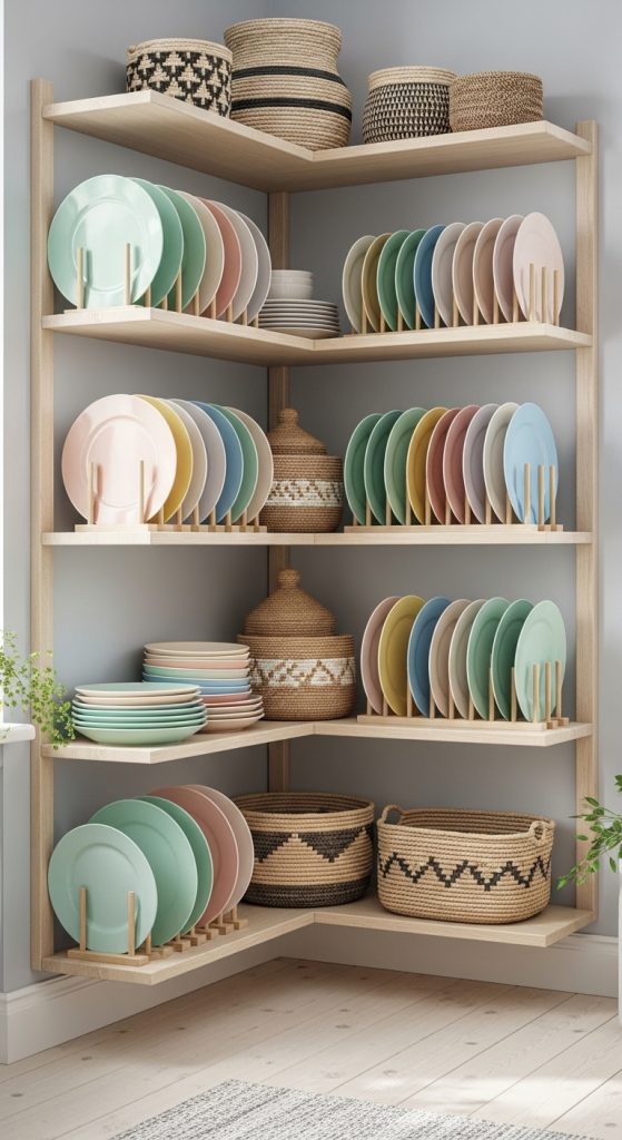 Utilize corner space by installing open shelves that wrap around. This maximizes storage in otherwise unused areas. Display colorful plates, mugs, or decorative baskets for an organized and visually appealing corner.