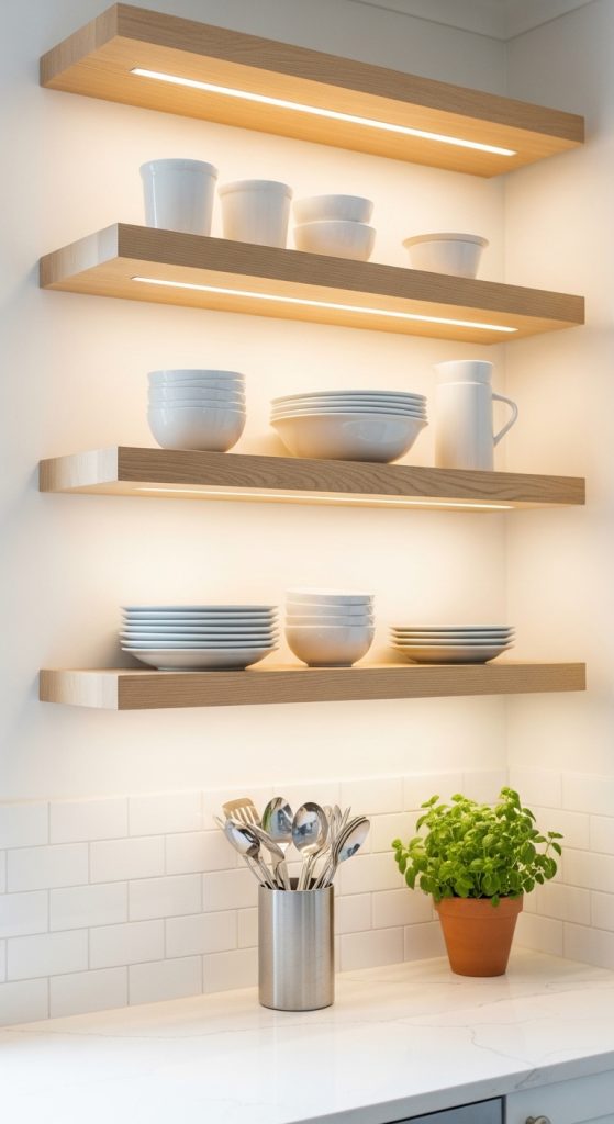 Add LED strip lights beneath floating shelves to highlight your items. This combination enhances the ambiance and adds functionality, making it easier to find items while cooking.