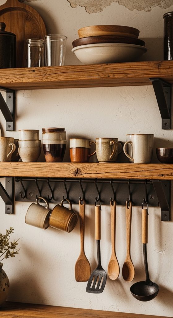 Include hooks beneath shelves for hanging mugs, kitchen towels, or utensils. This practical idea saves counter space and gives your kitchen a rustic, cozy feel.
