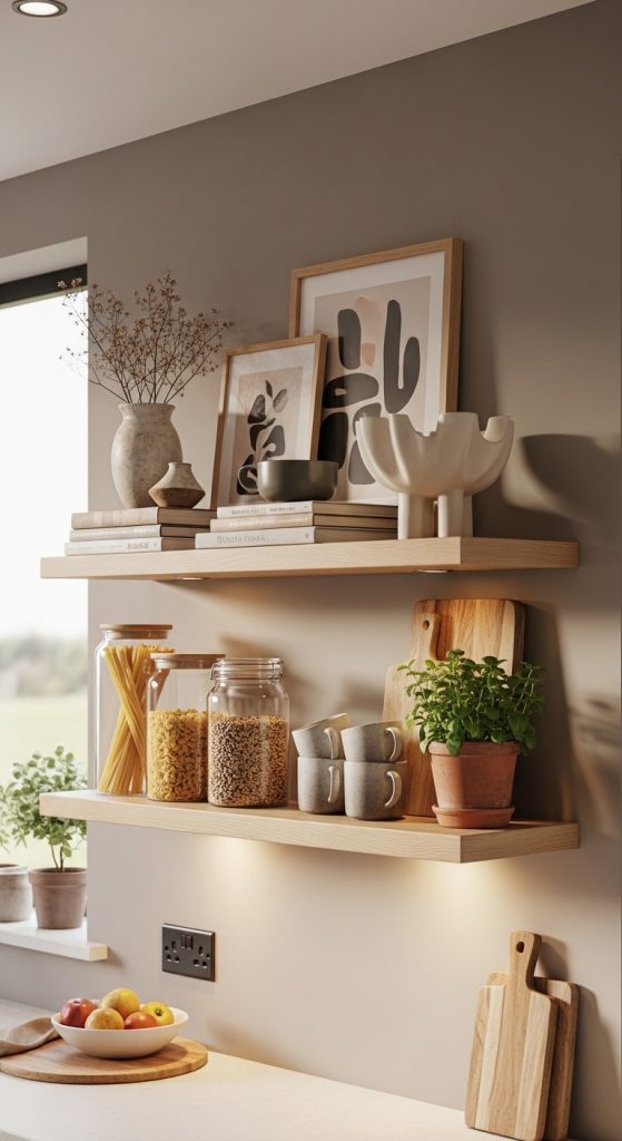 Create a two-tier shelf system for maximum storage. Use the upper shelves for decorative items and the lower shelves for frequently used kitchen essentials. It adds dimension and depth to the wall.