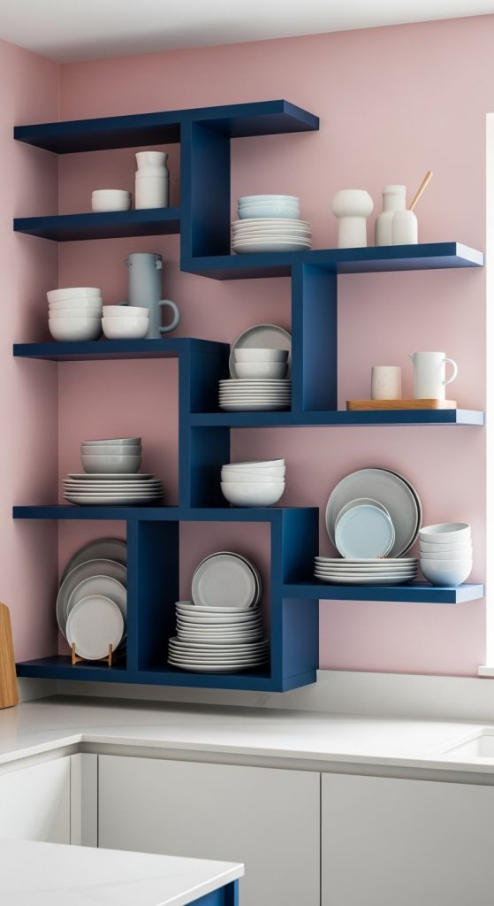 Paint your open shelves in a contrasting color to the kitchen walls. Bold colors like navy, sage green, or soft pastels can turn your shelving into a statement piece while showcasing your dishware.