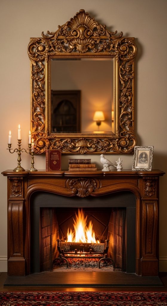 If you love vintage or traditional decor, an antique gold mirror is the perfect choice. The ornate detailing adds elegance and makes the fireplace look luxurious and timeless.