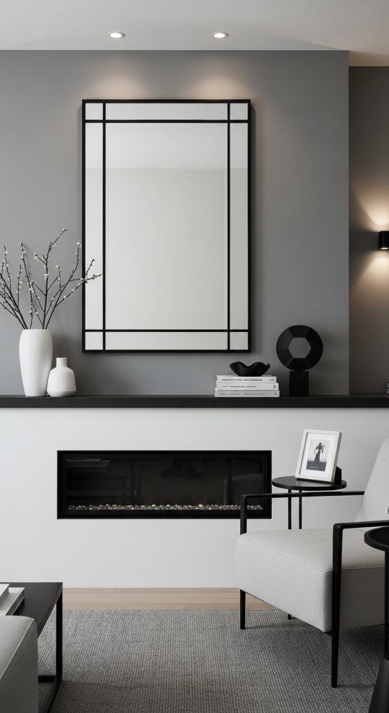 An oversized mirror above the fireplace creates drama and elegance instantly. Large mirrors reflect more light and visually expand the space, making them perfect for both small and large living rooms.