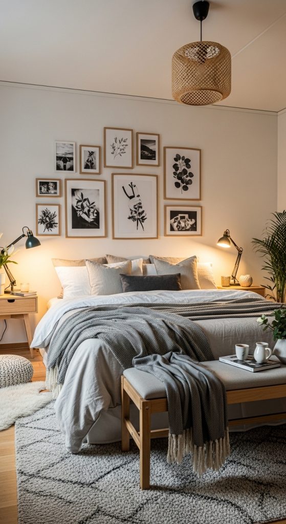 A gallery wall is one of the most popular and versatile decor ideas for bedrooms and guest rooms. It allows you to mix framed art, photography, prints, and typography to create a personalized focal point above the bed or dresser.