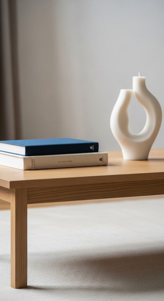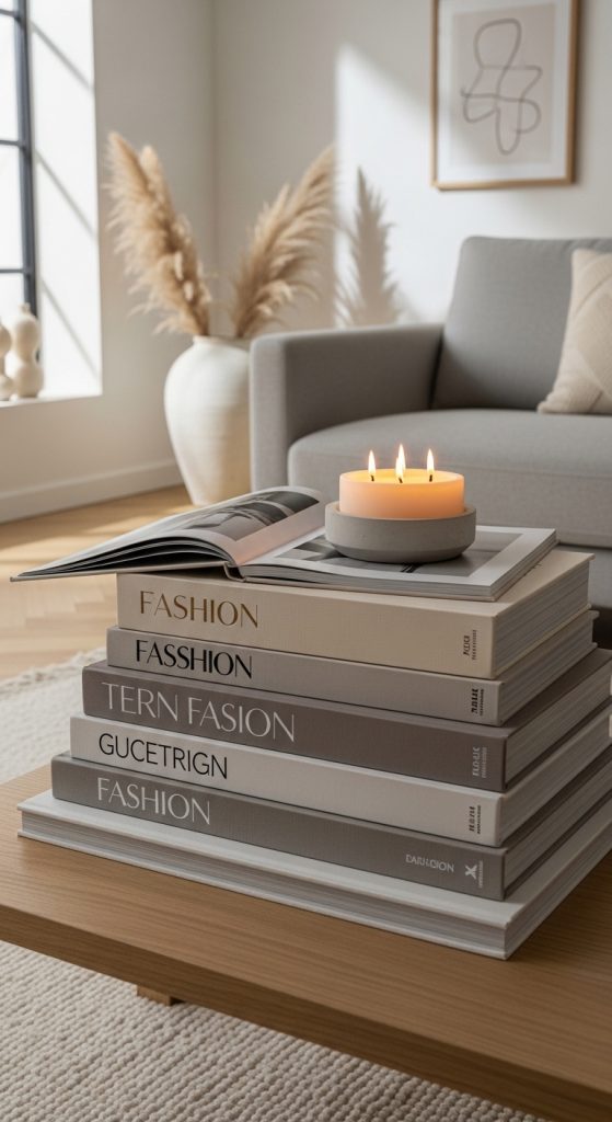 Stacking books horizontally is the most timeless way to display coffee table books. Choose 2–4 books and place them neatly in the center or corner of the table.