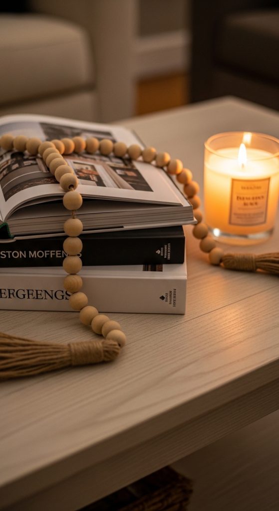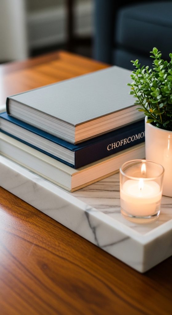 Layering different textures gives your coffee table a designer look. Combine books with candles, wooden beads, or a marble bowl.