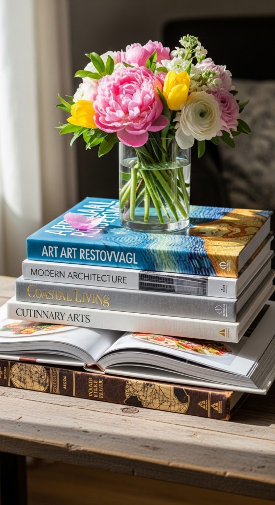 Flowers bring softness and life to a book display. Place a small vase beside or on top of the stack for a fresh, welcoming look.