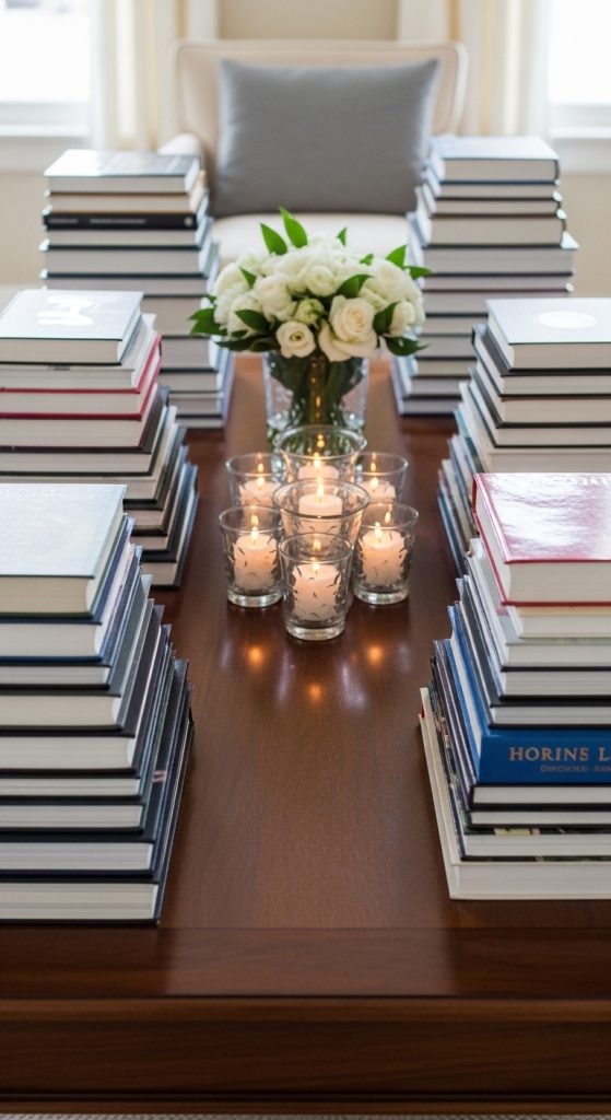 Place a candle, sculpture, or small plant on top of your book stack. This adds height and turns your books into a styled centerpiece.