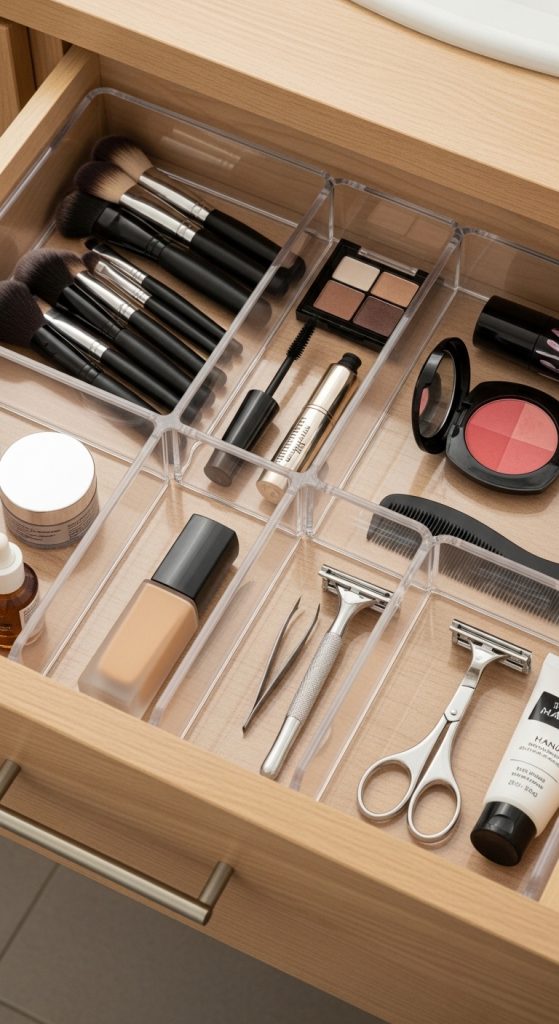 Keep drawers tidy with dividers. Organize makeup, brushes, grooming tools, and small items to prevent clutter and make everything easy to find.