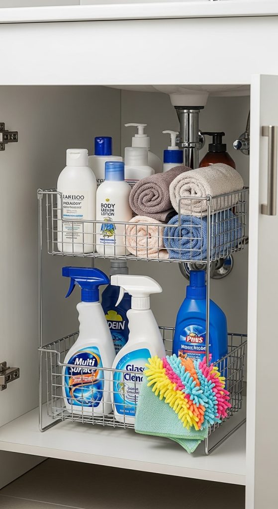 Stackable storage baskets maximize vertical space in cabinets or under sinks. Store cleaning products, extra toiletries, or hair tools efficiently.