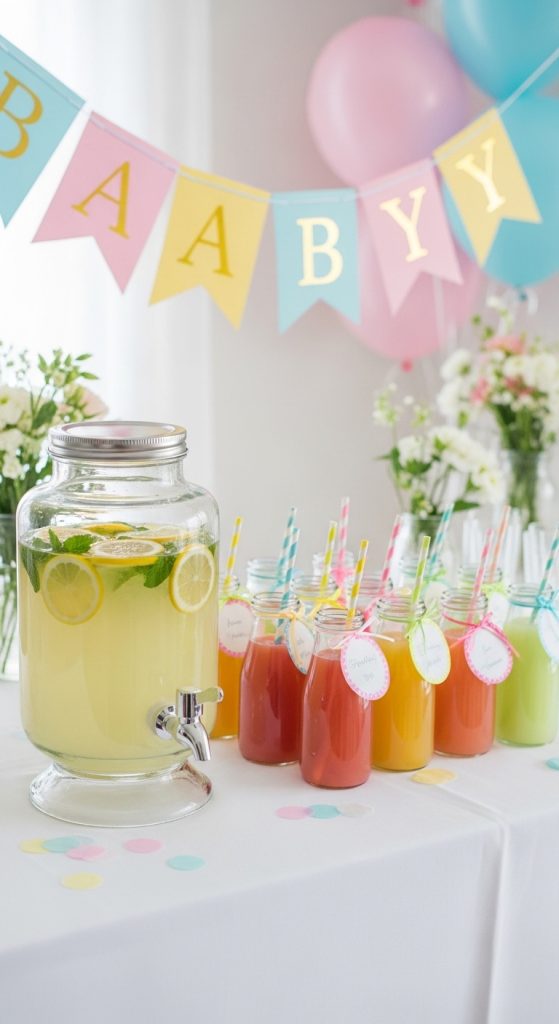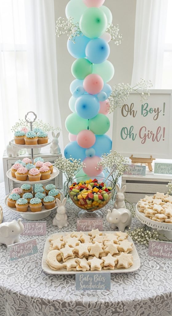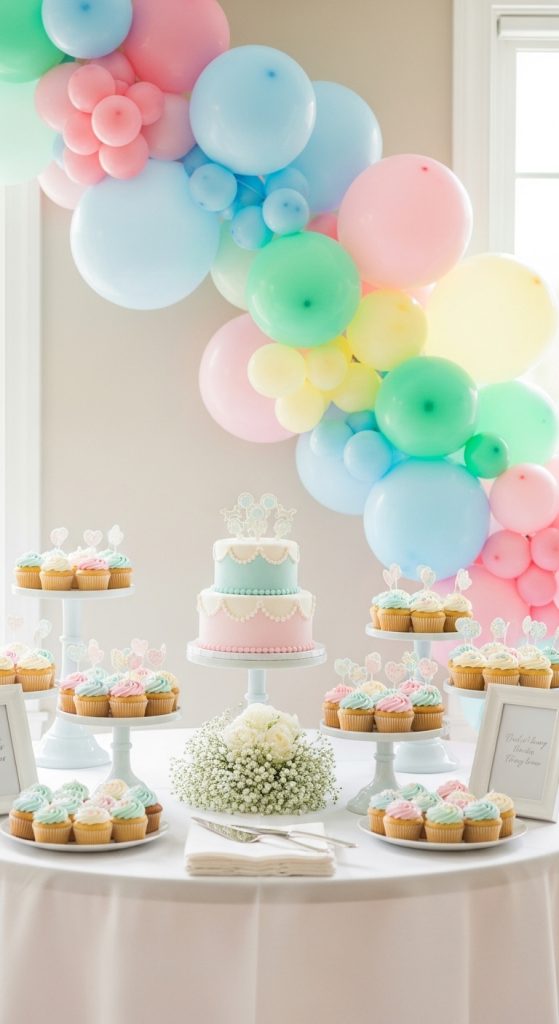 Balloon garlands remain one of the most popular baby shower décor trends. Adding a pastel balloon arch behind the food table creates a dreamy focal point that frames the snacks beautifully.