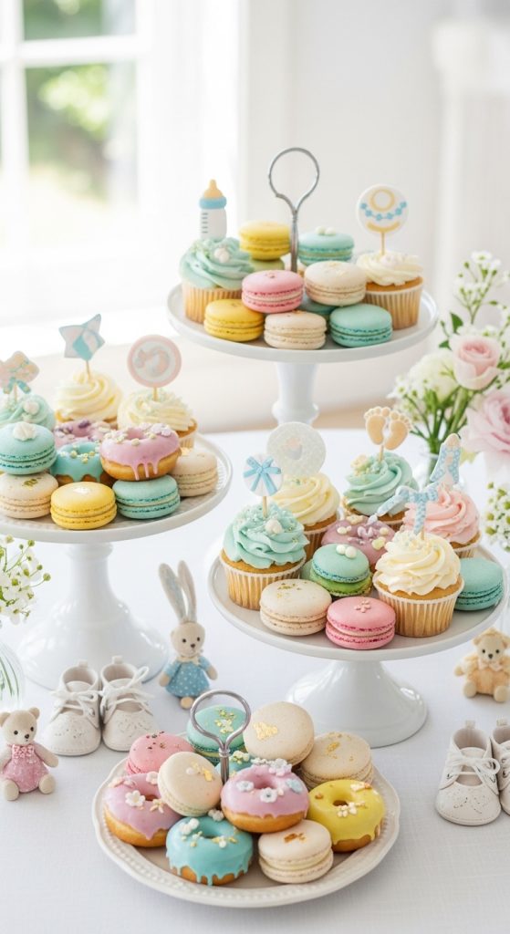 Display cupcakes, cookies, macarons, and mini donuts on different levels. The layered effect creates visual depth and looks stunning in photos.