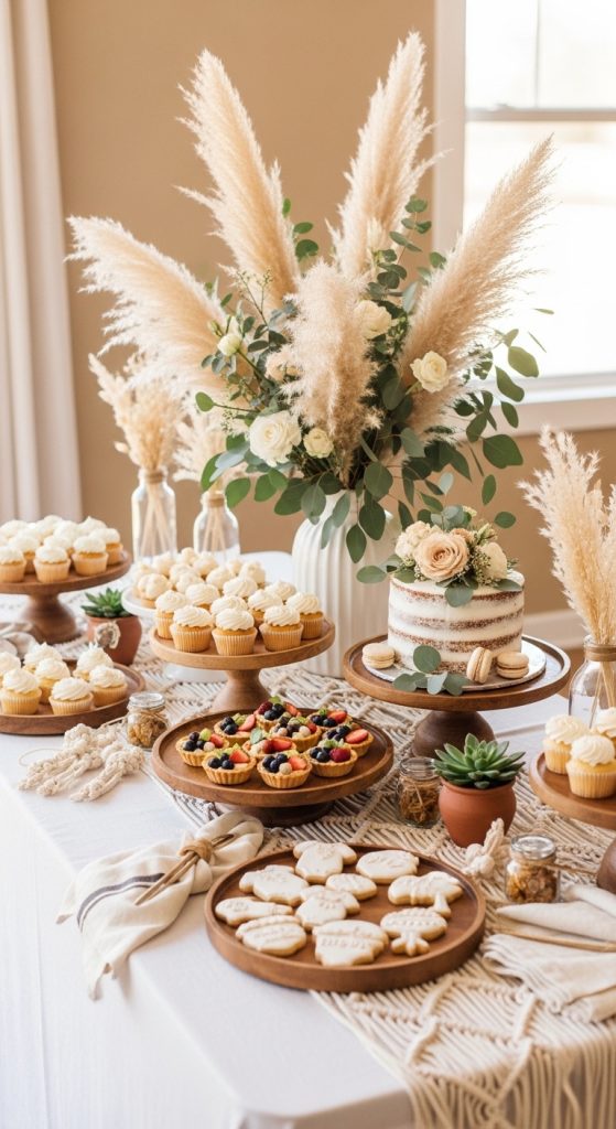 Boho baby showers are trending heavily on Pinterest. Add pampas grass, wicker trays, wooden cake stands, and beige linens for a warm, modern vibe.
